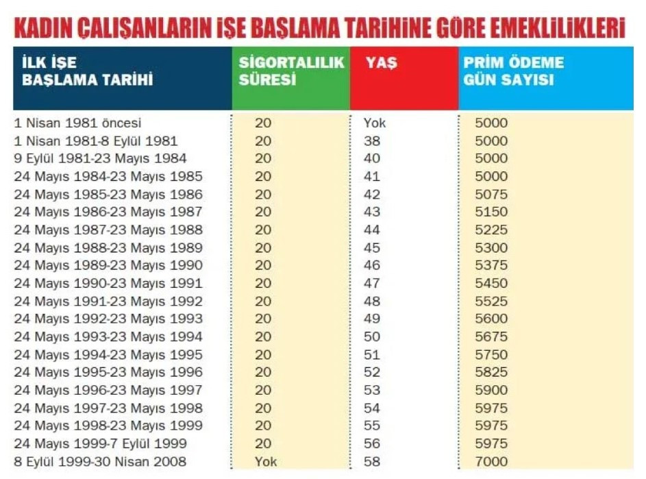1999–2008 arası işe başlayanlar 58 yaşında, 1 Mayıs 2008 sonrasında sigortalı olanlar ise 58–65 yaş aralığında emekli olabiliyor. Prim gün sayısı 5000 ile 9000 arasında değişiyor.