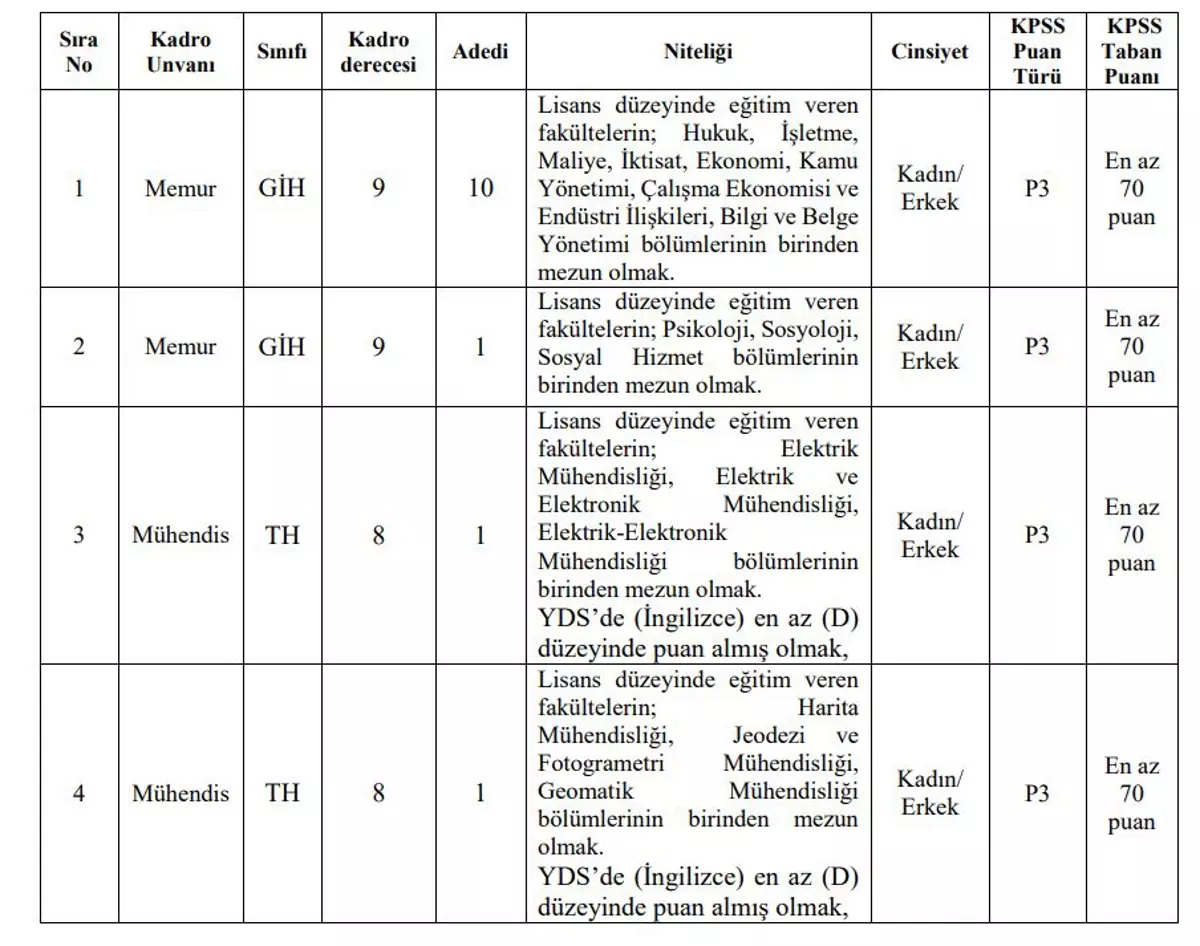 Ancak, 70 puanın minimum şart olduğu unutulmamalıdır. Başvuru yapılacak kadronun (unvanın) gerektirdiği eğitim düzeyine (Lisans, Ön Lisans veya Lise) göre ilgili KPSS puan türünden (Örn: P3, P93, P94) bu asgari puanın alınmış olması gerekmektedir. Hangi kadro için hangi puan türünün istendiği, belediyenin yayımlayacağı tam metin başvuru kılavuzunda netleşecektir.